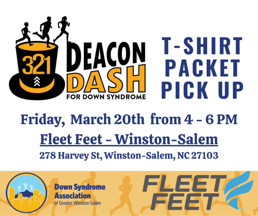 This will be our 9th annual 3-2-1 Deacon Dash for Down Syndrome and we are all excited to be back together again! The 3-2-1 Deacon Dash for Down Syndrome is a 5K race fundraising event with an extra .11 mile added for a 3.21 total distance for the awareness and support of individuals with Down syndrome! Most people have 2 copies of 23 different chromosomes, but individuals with Down syndrome are born with 3 copies of the 21st chromosome (the medical term for this is Trisomy 21).