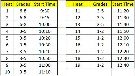 Every attempt is made to assure heats start at the stated time listed below. Please plan to arrive at least 1/2 hour prior to your heat start time.