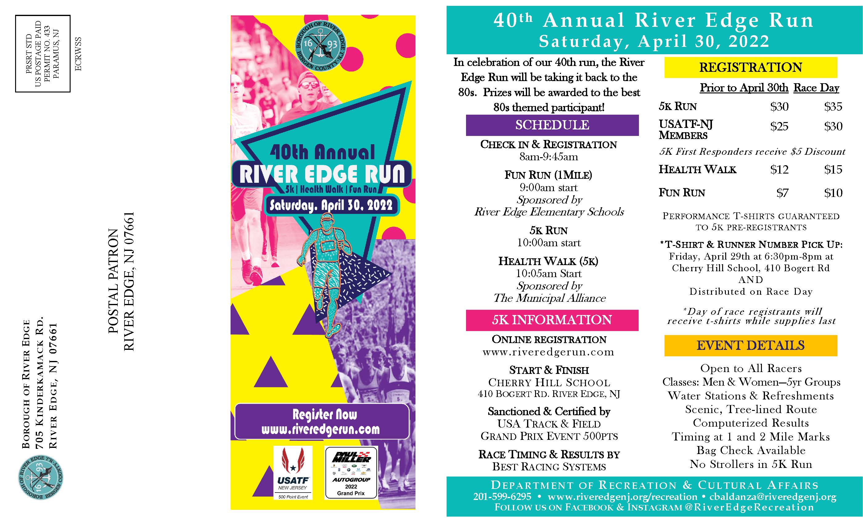The River Edge Run is a community-sponsored event that will feature a 5k Run, Health Walk, and 1-mile Fun Run.