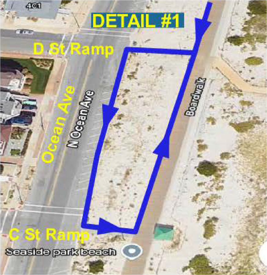 The 5K will start and finish near the Dupont Ave Boardwalk entrance in Seaside Heights, NJ. The check-in and festival area (i.e., packet pickup, pizza) will also be in that location.