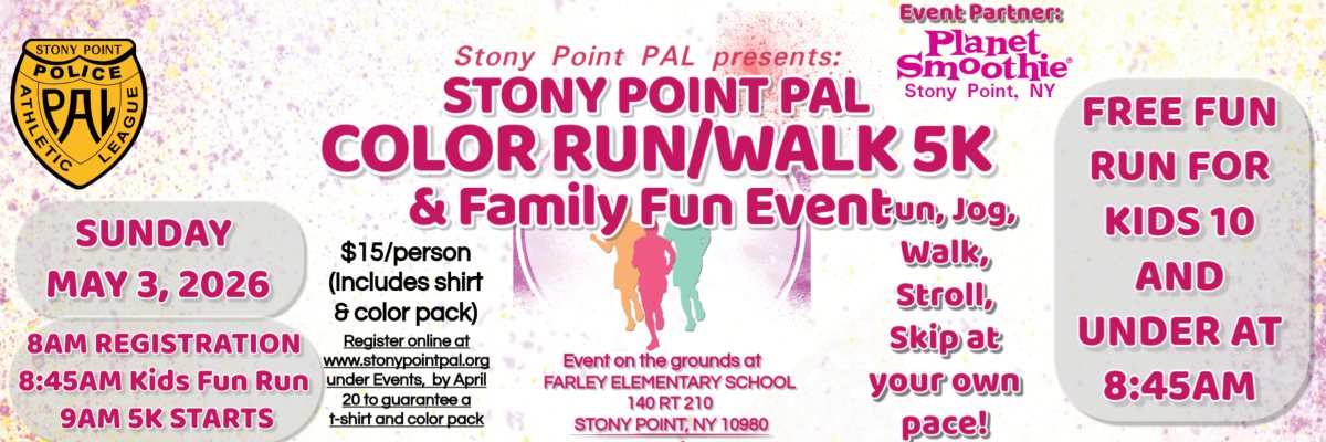 Stony Point Police Athletic League (SPPAL) Annual Color Run/Walk 5K on the grounds of Farley Elementary School, 140 RT 210, Stony Point, NY 10980 held Sunday, MAY 3, 2026. RAIN OR SHINE.