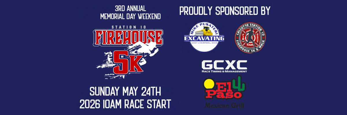 The third annual Station 10 Firehouse 5K takes place on Sunday, May 24th, 2026, at the Calcutta Volunteer Fire Department, which kicks off the St. Clair Township Memorial Day Festival. The address is: 15445 Pugh Road, Calcutta, Ohio 43920.