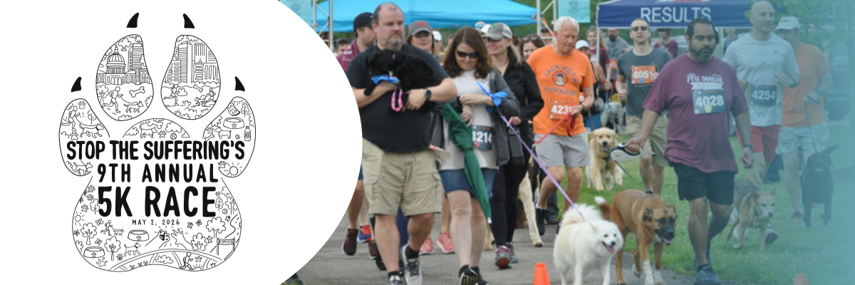 The annual 5K run/1 mile walk benefits Stop the Suffering, a 501 (c)(3) based in Columbus, Ohio that saves animals from shelters and other situations in which their lives might be at risk. STS adopts out about 500 dogs a year, transports around 4,000 cats and dogs from rural shelters and puppy mills, to rescue organizations. STS also sponsors the vet care, boarding expenses and other costs when needed to help save an animal's life. Additionally, STS has a program that helps with many local municipalities spay and neuter programs in order to help control the pet population.