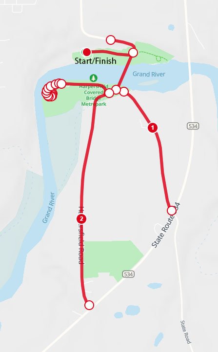 Course- Start/Finish as marked. Course follows the road, turn LEFT and run part way up the hill, turn around, cross covered bridge (USE Sidewalk of bridge), turn LEFT to end of State Rd & 534, Turn around, turn LEFT to end of Harpersfield Rd & 534, Turn around, turn LEFT to end of drive, proceed on foot path/board walk (may be slick if wet) this will turn you around, Turn LEFT to cross the Covered Bridge (USE Sidewalk of bridge), Turn LEFT to finish.