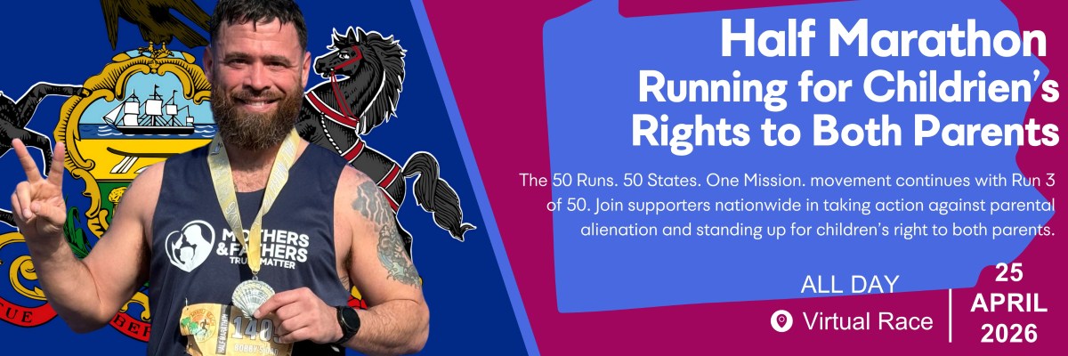 This race is part of a larger effort to run 50 half marathons in 50 states, completing one race each month. Each run is dedicated to raising awareness about parental alienation, family court practices that separate children from a loving parent, and the urgent need for children to have reasonable access to both parents.