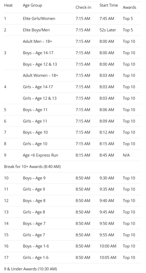 The 2025 race will feature more condensed start times to make it easier on parents. Heat assignments below are tentative and will be finalized closer to race day.