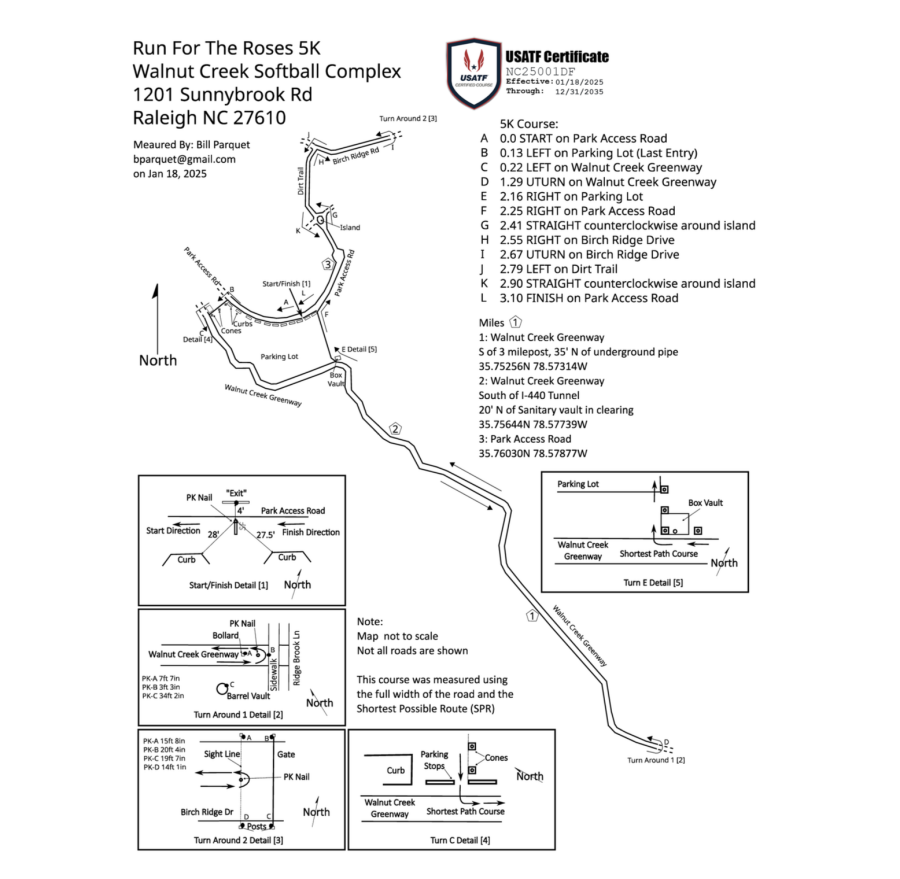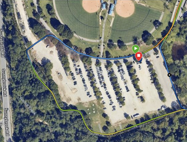 The race course is a certified USATF course that will be run mostly (over 2 miles) on the Walnut Creek Greenway and no major hills. There are three short off road sections of the course: a gravel parking lot to enter and exit the greenway and a dirt path connecting the softball complex to reach Birch Ridge Drive. Below is a map to help you better understand where you'll enter and exit the greenway.