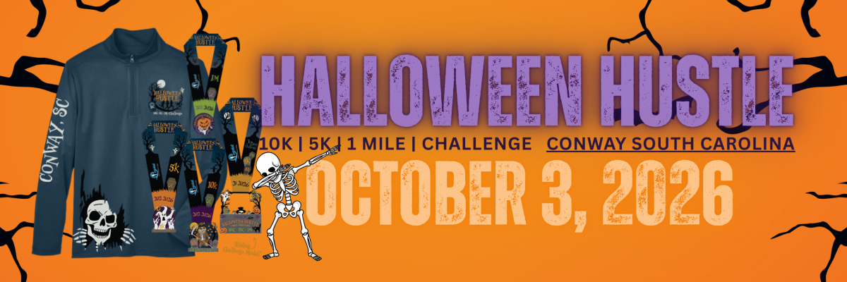 Join us in Conway, South Carolina on October 3rd for the annual Halloween Hustle. Conway is known for rolling out the red carpet and welcoming visitors to its festive streets all decked out for different holidays and during the month of October their name is officially changed to The City of Halloween. You will run through the city of haunts on the certified 10K and 5K course that will finish along the beautiful and festive Riverwalk.