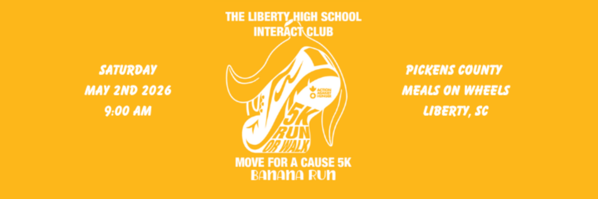 The 5K is presented by the Liberty High School Interact Club- a high school affiliate of the Easley Rotary Club that works to promote service above self and international understanding. The Move for a Cause 5K is a 5K race that will be held at the Pickens County Meals on Wheels Center in Downtown Liberty, SC on Saturday, May 2nd, 2026 at 9:00 AM. The address for the race is 349 Edgemont Ave, Liberty, SC 29657. This year is a Banana Run! We will have prizes for best "A-peeling" costume so be sure to bring your banana suit! All proceeds will go to Action Against Hunger - an international charity that works to end all hunger across the globe!