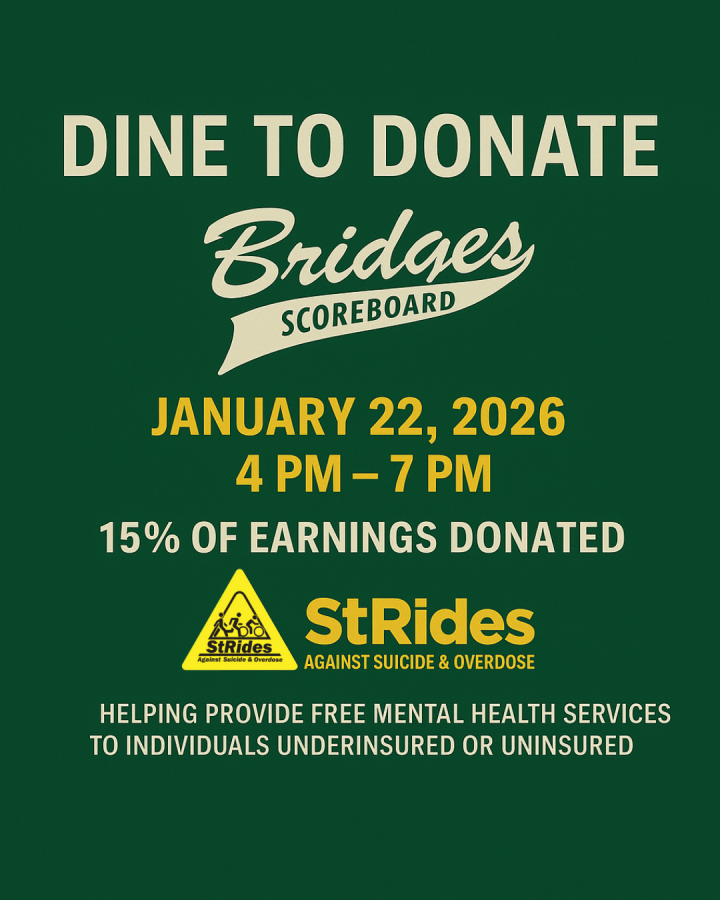 Enjoy a night out at Bridges Scoreboard, where 15% of earning will be donated to StRides Against Suicide & Overdose, helping individuals who are underinsured or uninsured receive mental health support.