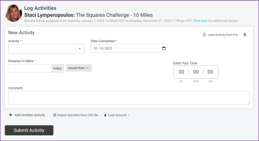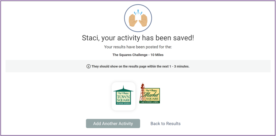 After you hit submit, you will see your activity saved. Please note, it will take 3-5 minutes for the results to update the total in your table. Please be patient. If you need to enter more activities, you can do so as well. Some people prefer to enter after each activity, others enter every few days.