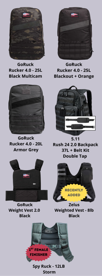 The Spy Ruck will be awarded to the first female participant to finish 3 laps carrying 25 pounds of food.