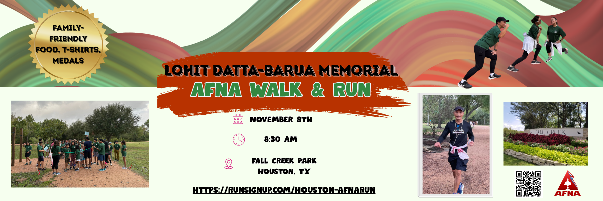 Assam Foundation of North America (AFNA) organizes Annual Walk & Run event at multiple locations across USA. This is our second annual event in Houston. Funds raised will be donated to Kalyani Niwas and Ashaneer, Assam, India, centers for destitute and specially abled children, to cover their medical expenses. You can visit our web site or Facebook page to know more about our programs.