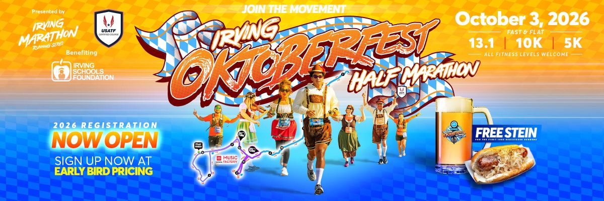 Sign up for the Irving Oktoberfest Half Marathon to enjoy the scenic routes through the Irving-Las Colinas Urban Center, then cross the finish line and enjoy the Irving Oktoberfest Post-Race Party at Toyota Music Factory, America’s #1 Concert Venue, centrally located in Dallas-Fort Worth minutes from the DFW airport!