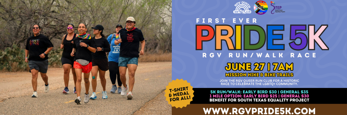 English: Join us for the Rio Grande Valley's first ever Pride 5k! Hosted by the RGV Queer Run Club, the proceeds of this race will benefit South Texas Equality Project (STEP).