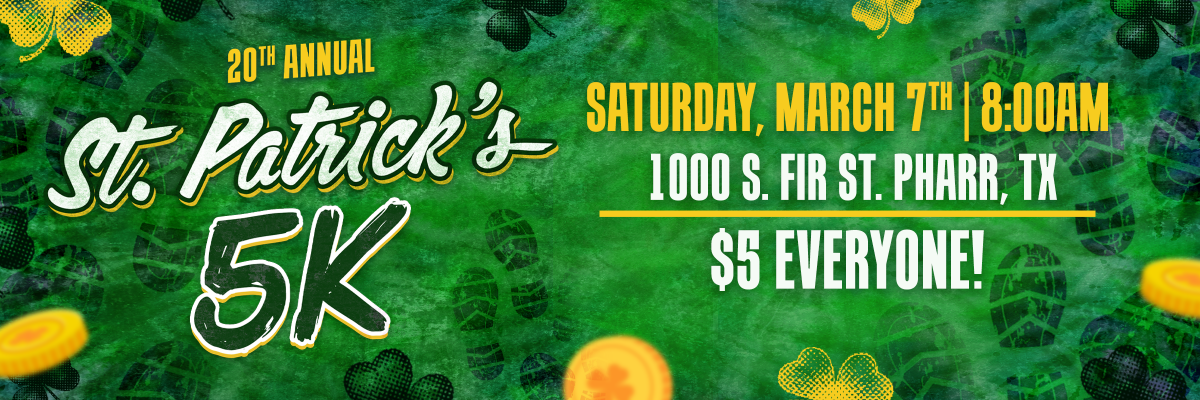 Get ready for a day of family fun, fitness, and festive celebrations at the 20th Annual St. Patrick's 5K, brought to you by Pharr Parks and Recreation! Lace up your running shoes, put on your favorite green attire, and join us for an unforgettable experience.