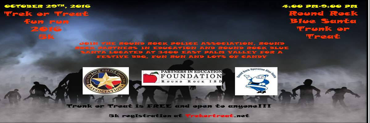 The Police Officers Association along with Round Rock Partners in Education and Blue Santa our partnering for the First Annual Zombie Trek or Treat Fun Run on October 29th, 2016 at Dell Diamond 4:00PM to 8:00PM