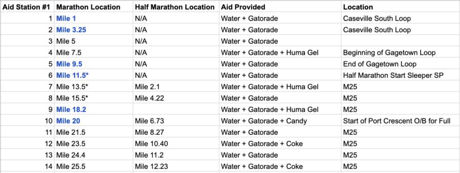 Below is a chart listing the available aid stations on course during the Rock CF Thumb Coast Marathon and Half Marathon. Aid stations will feature water and Gatorade at all stations with a mix of other support. Note: Aid Stations locations and options available may change slightly due to course modifications and availability.