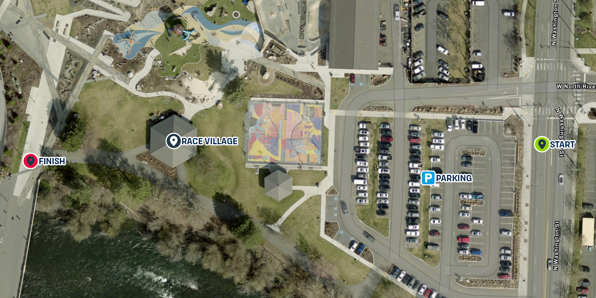 Participant parking available along surrounding streets, Spokane Arena lots, and Riverfront Parking - Lot 1