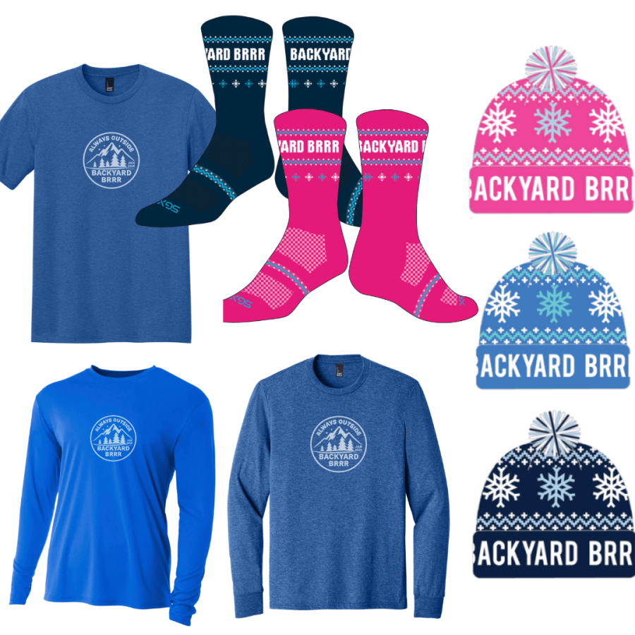 This year we are offering a choice of super sweet SGX Socks (they are nice), t-shirt (long and short sleeve options), OR a fun pom winter hat by Boco Gear. The art on this year's shirt is new and highlights a new variation of the "Always Outside" theme.