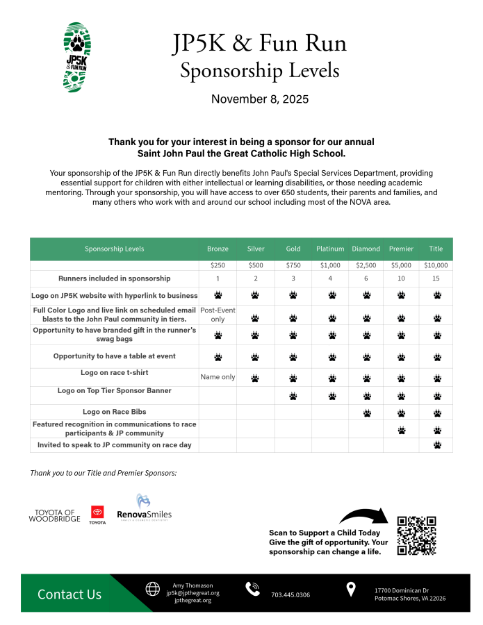 The JP5K & Fun Run is a fundraising event that supports the Special Services Department at Saint John Paul the Great Catholic High School. Everyone is welcome! All students, family, and friends are invited to participate in the JP5K. The cost of the race is $30 for early bird (ending October 15th) or $35 per person after October 15th, multi-person discounts available on the sign-up page.