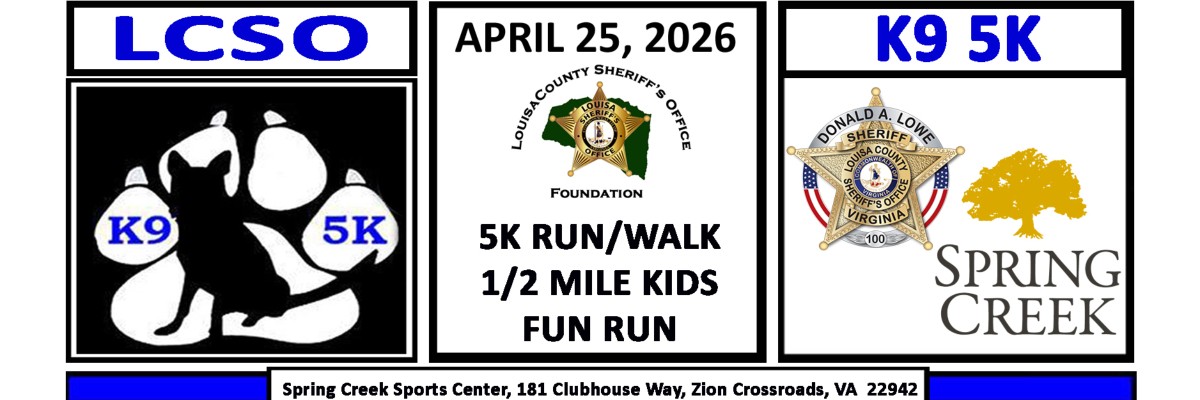 Join the Louisa County Sheriff’s Office (LCSO) for their Annual K9 5K Run/Walk! This event helps raise funds for many of our community programs and the LCSO K9 Unit. Spring Creek generously provides the venue. Whether you’re an experienced runner or just getting started, this rolling 5K course with a downhill finish is a great way to challenge yourself while supporting an amazing cause.
