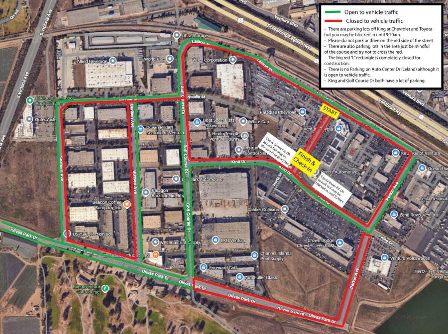 Just added - You can park in the vacant lot at 6580 Auto Center Dr. This area will not be directly affected by the course so if you need to leave right away this will allow you to quickly jump on the freeway at Johnson Dr. This lot is about a 5 minute walk to the start area (walk on Auto Center Dr and turn left on Hofer.)