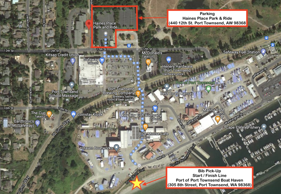 There is plenty of parking at the Haines Place Park and Ride (440 12th St, Port Townsend, WA 98368). It is about a 10 minute walk from the Haines Place Park and Ride to the start line. There is a sidewalk and signage from Haines Place Park and Ride to Port of Port Townsend Boat Haven - Starting Line - 305 8th Street, Port Townsend, WA 98368.
