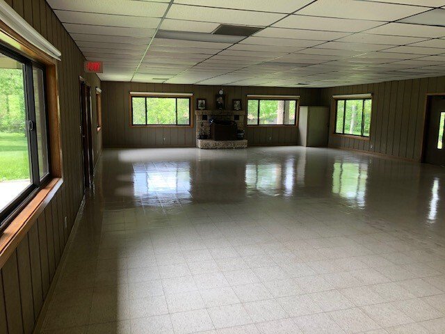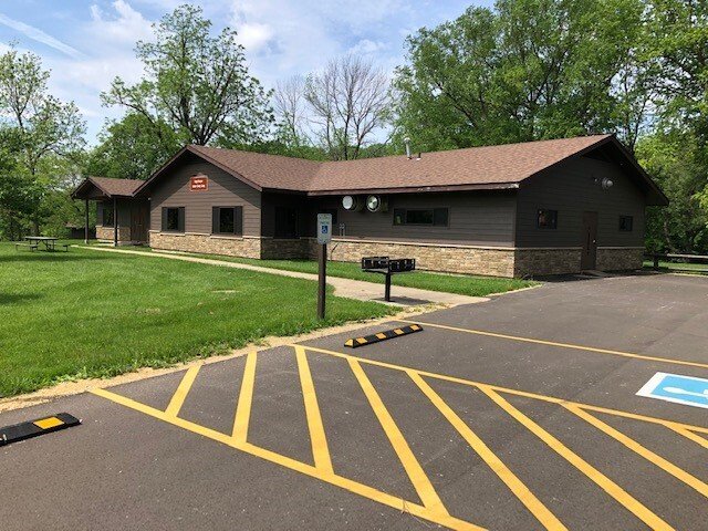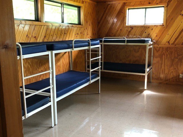The Hugh Harper indoor group camp is a modern facility designed for organized groups. The facility consists of a lodge and four dormitories. The lodge includes a full commercial kitchen, dining area and a recreation room with fireplace and television. The kitchen is equipped with a gas range (two ovens, six burners and a griddle), large refrigerator and freezer, microwave, commercial dishwasher, coffee maker and all cooking and eating utensils. Four dormitories accommodate 27 people each. Each dormitory has two bathrooms complete with showers, flush toilets and sinks. A sand volleyball court and softball field is located adjacent to the lodge. A large fire ring and amphitheater is located between the dormitories and lodge. A large charcoal grill is available just outside the kitchen.