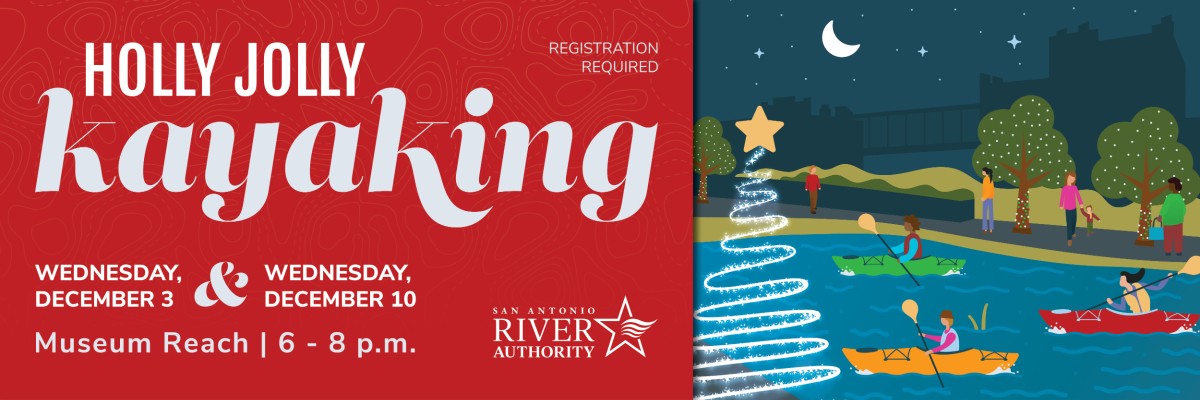 Night Kayaking on the Museum Reach is back! Join us for this unique opportunity and enjoy the holiday lights along San Antonio River. Reserve a kayak provided by the San Antonio River Authority or select a slot to bring your own.