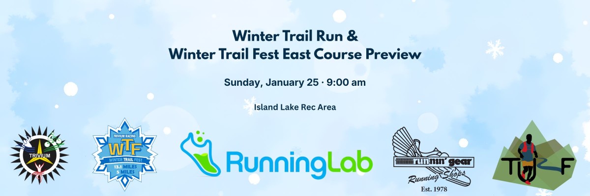 Join us for a winter trail run and Winter Trail Fest East course preview run at Island Lake!  Trivium Racing, Running Lab, Runnin' Gear, Unofficial Run Club, and Black Men Run TURF (Trail & Ultra Running Fanatics) are hosting and all are welcome.  We'll run the WTF East 5 Mile loop and have an option to run it twice.