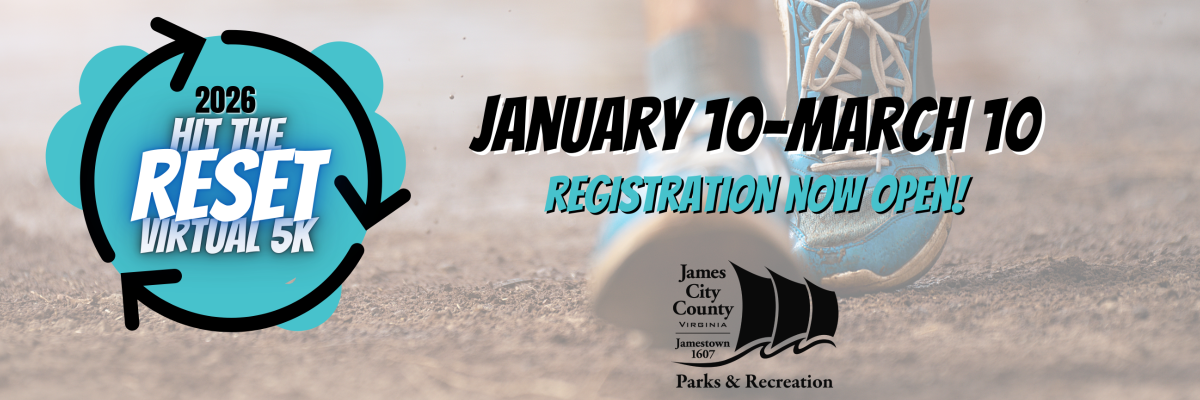 It’s time to put 2025 in the past and HIT THE RESET! We are racing into 2026 with positive resolutions—let’s move forward together! Join James City County Parks & Recreation for their fourth annual virtual 5K! You can complete this virtual 3.1-mile run/walk anywhere, with anyone, at any time. Complete within these dates and submit your photos online. Race registration includes a commemorative medal and T-shirt. James City County has some of the most beautiful trails in Virginia. If you choose to run/walk your 5K on one of our trails, submit your location photo and receive an extra entry into our raffle. You will be contacted for packet pick-up at the James City County Recreation Center located at 5301 Longhill Road. If you are not local and would prefer to receive your packet by mail, shipping arrangements can be made; please select this option during registration. For any specific event questions, contact kristen.tolj@jamescitycountyva.gov. or 757-259-4176