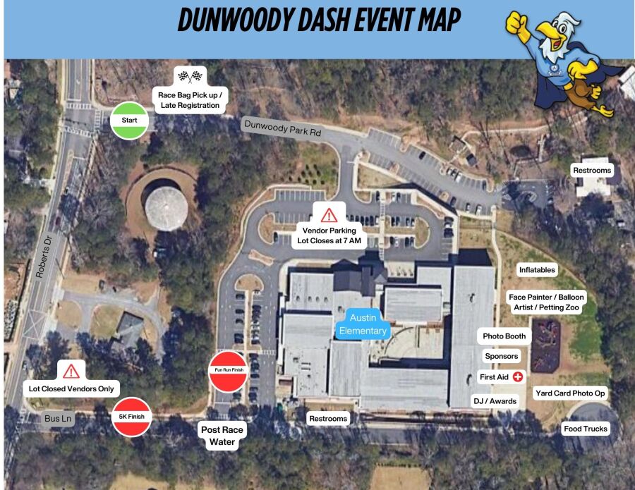 Austin’s entire campus will be pedestrian-only for the entire event, and both entrances to the school will be closed. Please park and walk to campus. Suggested parking locations include Holly Bank Circle, Dunwoody Knoll Drive, Wynterhall Swim & Tennis, or at Dunwoody Village. If you have a permit for handicap parking, please email dunwoodydash@email.com