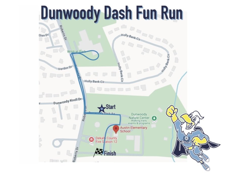 The Fun Run/Walk route is approximately 1 mile and starts near the traffic light at the Austin/Dunwoody Nature Center entrance. The route takes participants to Wildcat Park, back down Roberts through the start line and into Austin's parking lot. The Finish Line is in the bus lane. (map below)