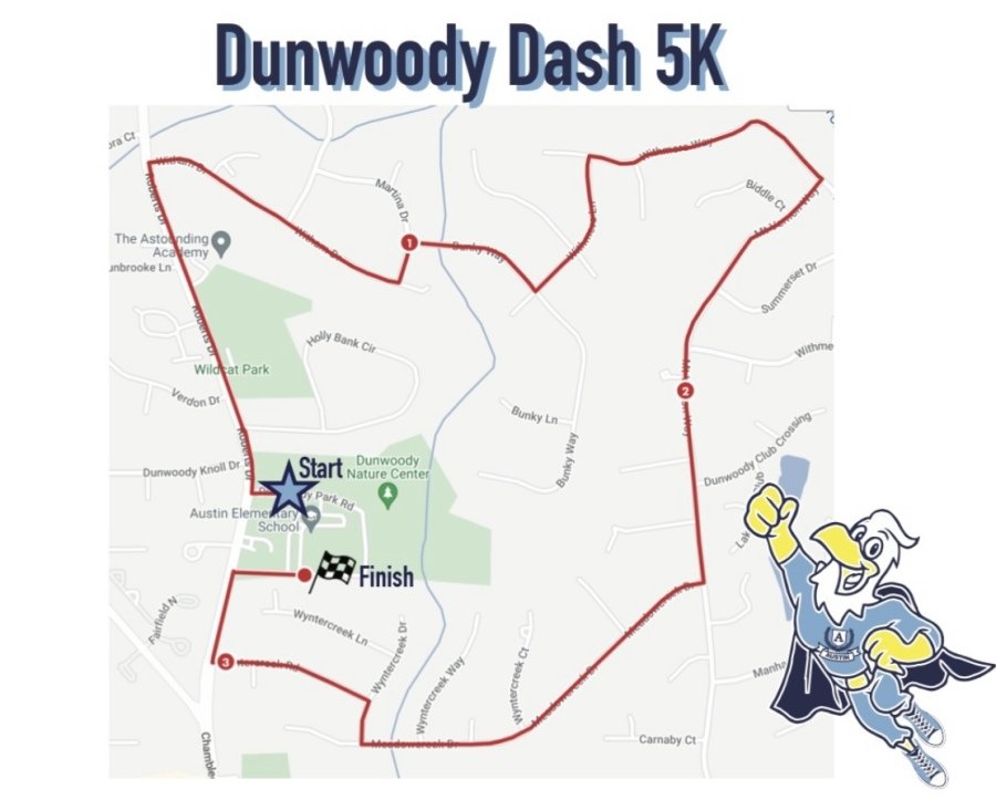 The 5K starts at 8:00 am near the traffic light at the Austin/Dunwoody Nature Center entrance. The course will be well-marked and participants will be escorted by Dunwoody Police. A water station will be available near the 2-mile marker. The Finish Line is in the bus lane. (map below)